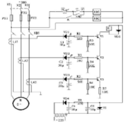 若由于某種原因造成三相電源中任一相斷相時, 則該相電壓信號為零, 相應(yīng)的晶體管將截止, 使繼電器 K 和交流接觸器均釋放, 切斷電動機(jī) M 的工作電源, 從而保護(hù)電動機(jī)不會因缺一相電源, 變成兩相運(yùn)行, 過熱而損壞。
